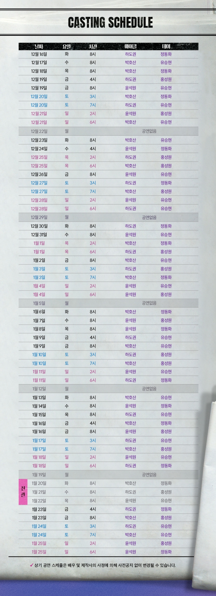 - 화, 수, 목 오후 8시 / 금 4시, 8시 / 토 3시, 7시 / 일, 공휴일 2시, 6시 (월 공연 없음)