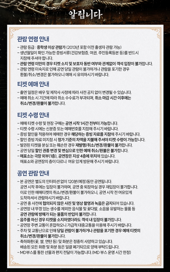 | 유효기간(이용조건) | 2026년02월03일(화) ~ 02월08일(일) (예매한 공연일시에 한해 이용 가능) | ||||||||