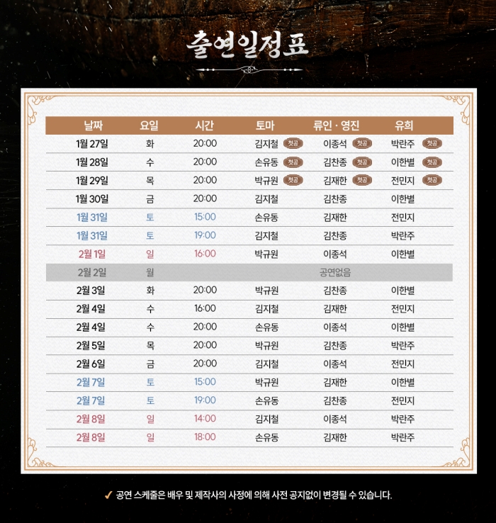 - 화, 목, 금 오후 8시 / 수 4시, 8시 / 토 3시 7시 / 일, 공휴일 2시, 6시 (월 공연 없음)
