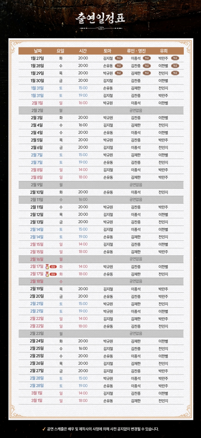 - 화, 목, 금 오후 8시 / 수 4시, 8시 / 토 3시 7시 / 일, 공휴일 2시, 6시 (월 공연 없음)
