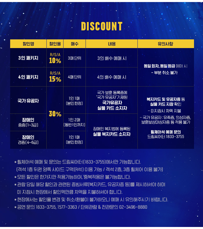티켓오픈 시점부터 1시간 동안 고객센터를 통한 전화예매는 불가한 점 양해 부탁드립니다.