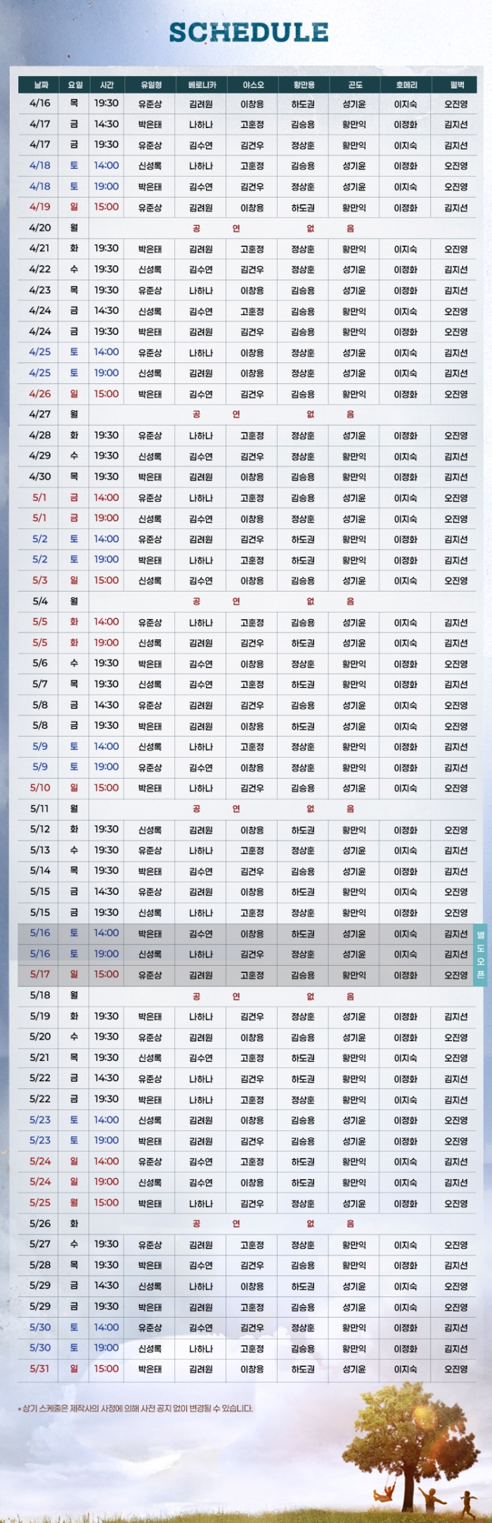 *05/01(금), 05/05(화), 05/24(일) 오후 2시, 7시