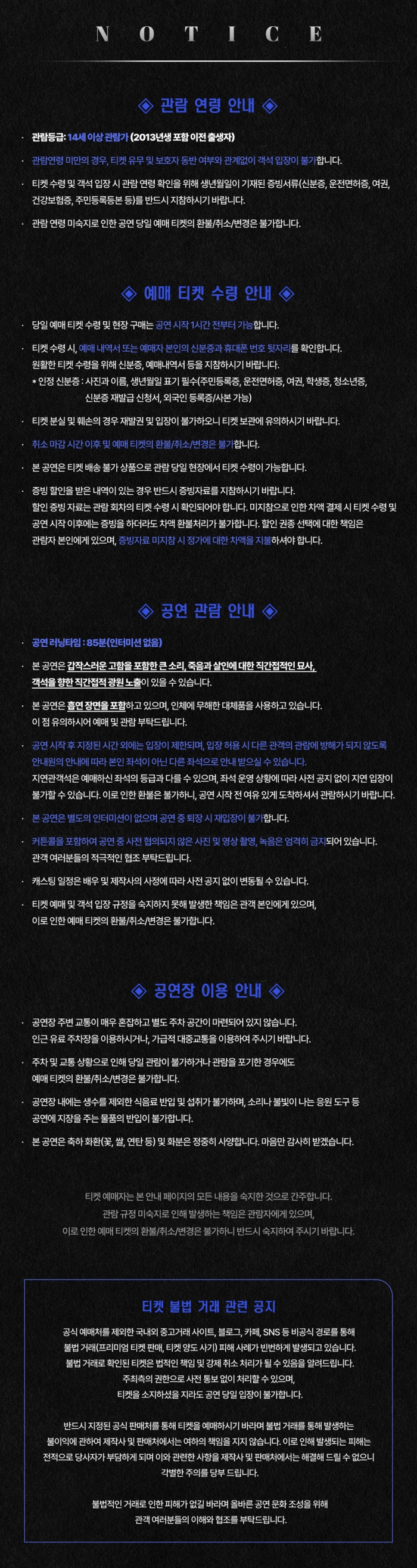 - 화~목 오후 8시 / 금 4시, 8시 / 주말 및 공휴일 3시, 6시30분 (월 공연없음) * 3/16(월) 오후 8시