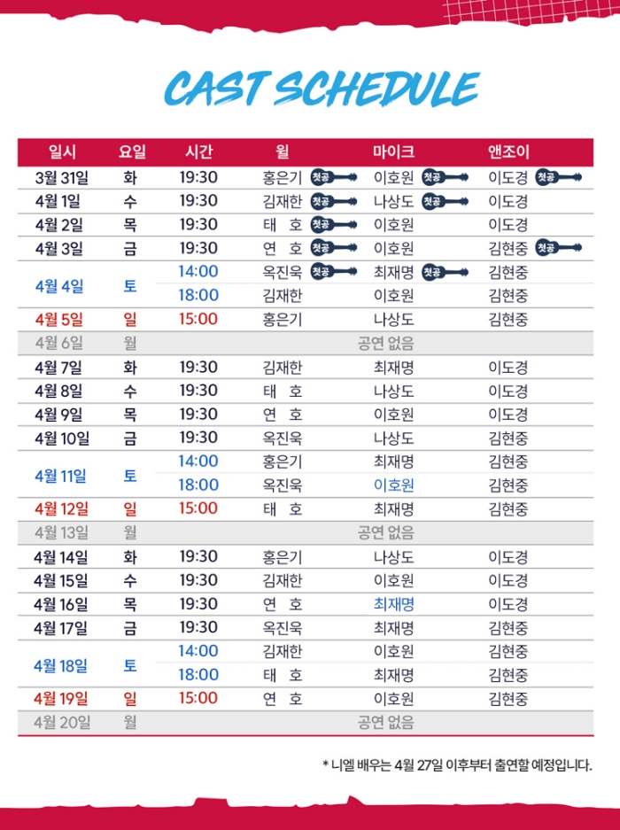 | 유효기간(이용조건) | 2026년03월31일(화) ~ 04월19일(일) (예매한 공연일시에 한해 이용 가능) | ||||||||