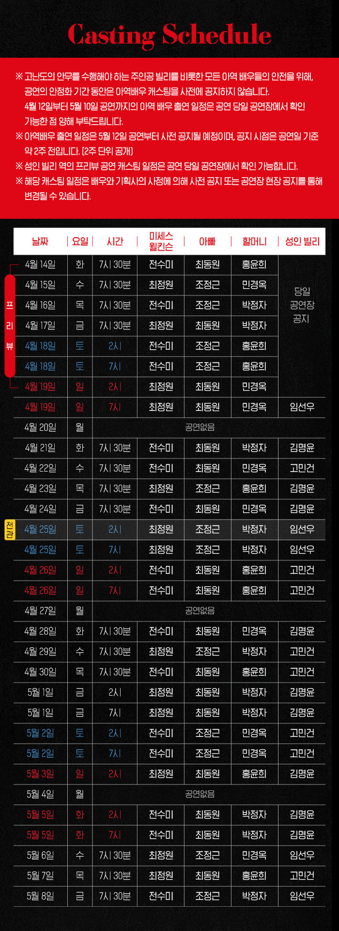 - 화~금 오후 7시30분 / 토, 일 2시, 7시 (월 공연없음)