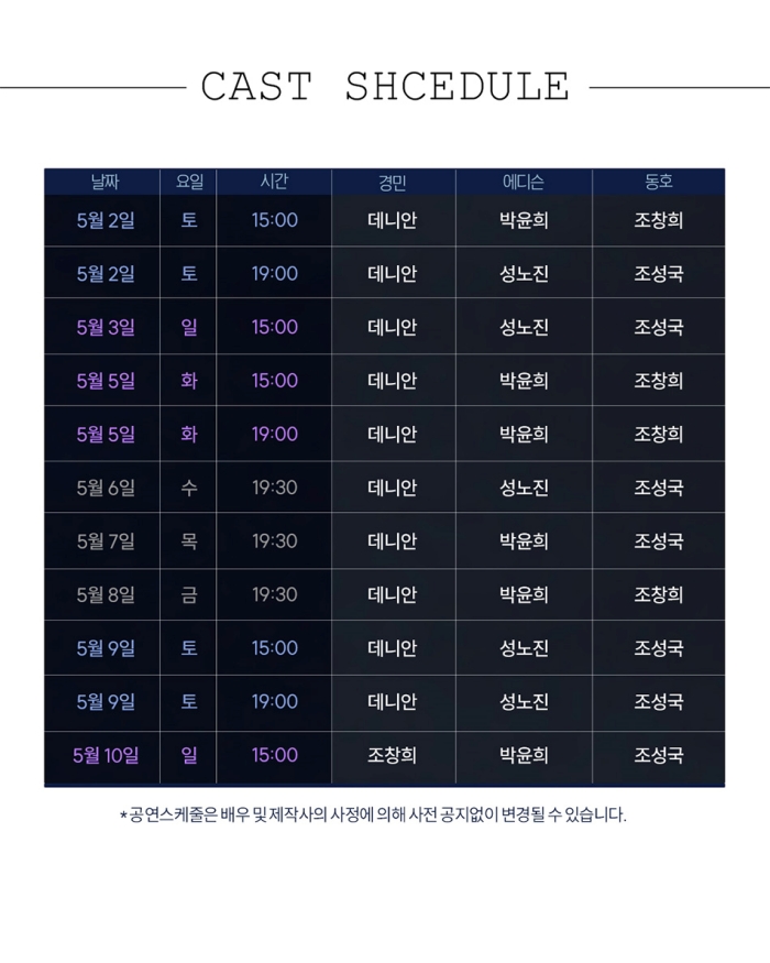평일 오후 7시30분 / 토 공휴일 3시, 7시 / 일 3시 (월 공연없음)